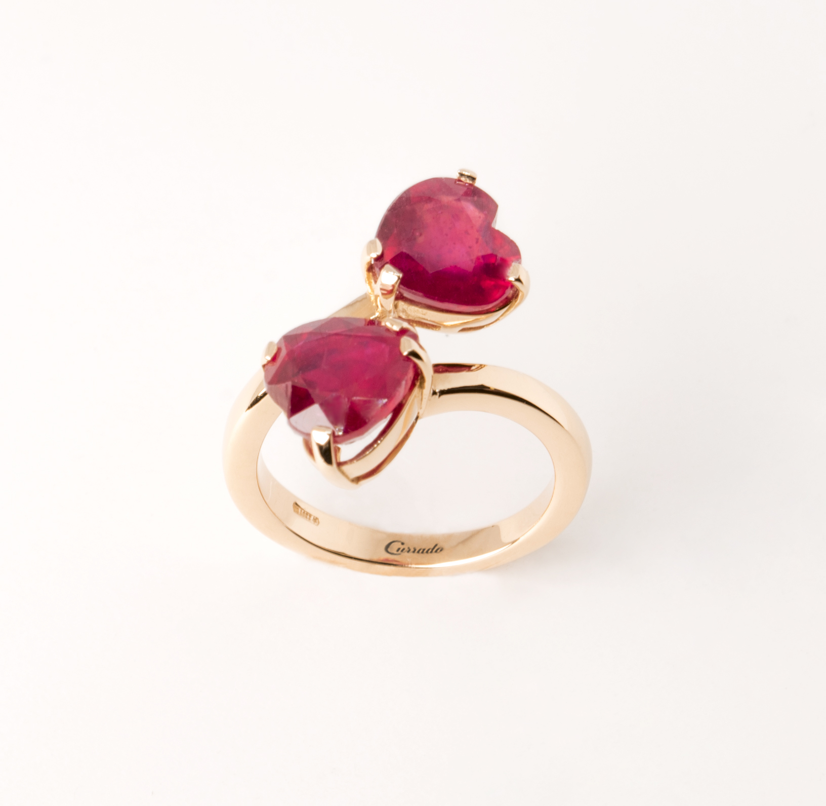 Anello “Cuori” contrarié in oro rosa 18kt con due rubini taglio cuore del peso totale di ct. 7,48