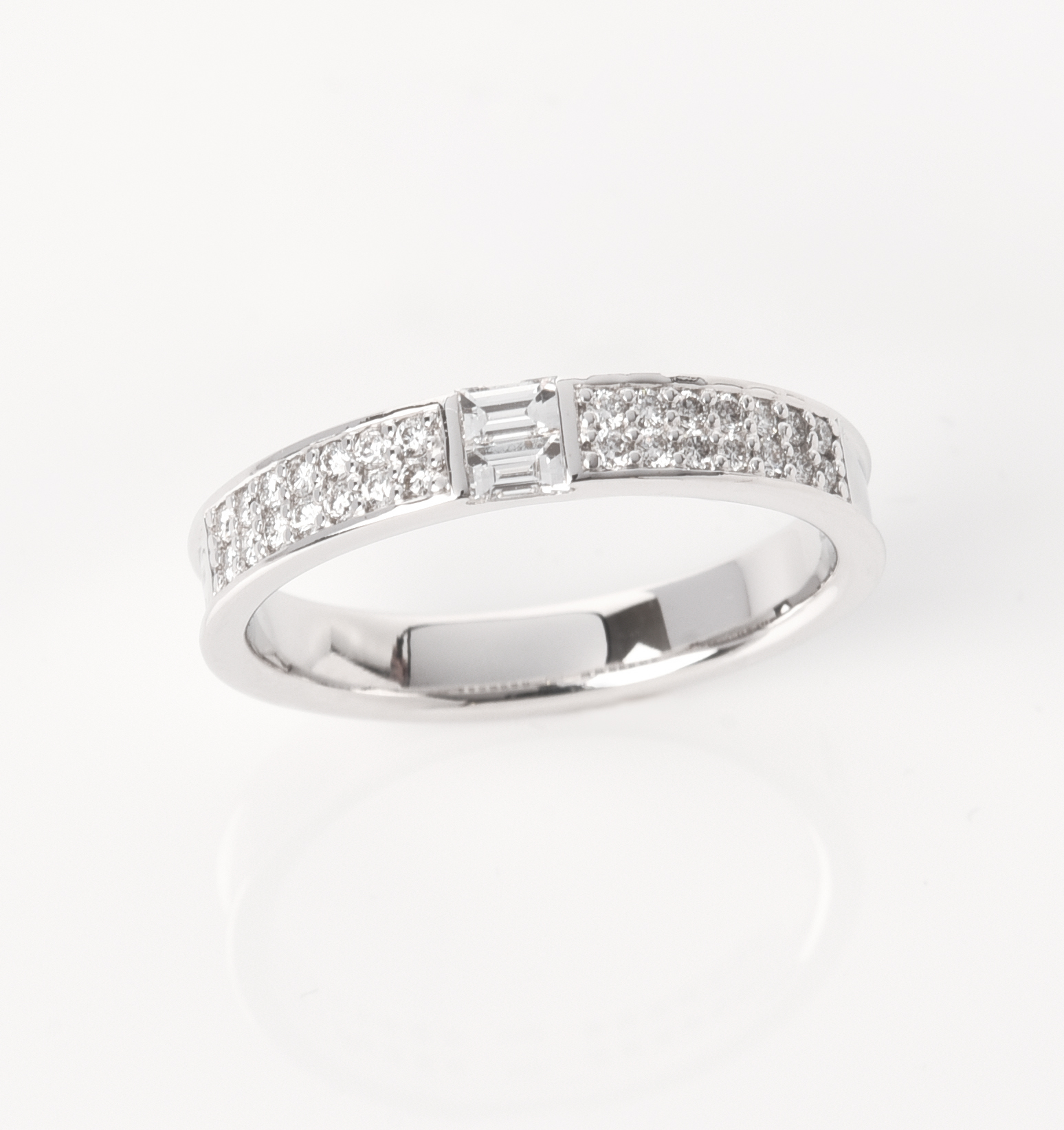 Anello fede in oro bianco 18kt di gr.5,37 con incastonati diamanti taglio baguette e diamanti taglio brillante del peso totale di ct. 0,43.