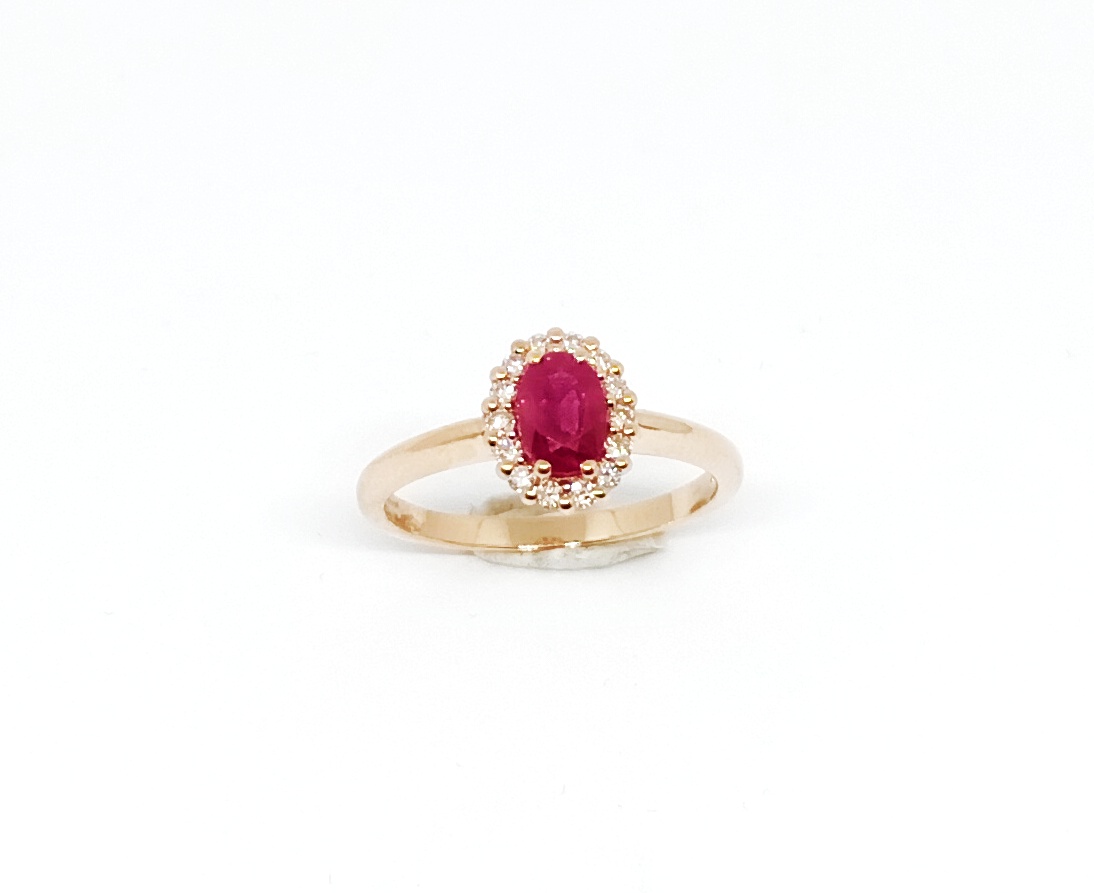 Anello in oro rosa 18kt di gr.2,60 con incastonato rubino taglio ovale del peso di ct.0,61 e diamanti taglio brillante del peso totale di ct.0,16