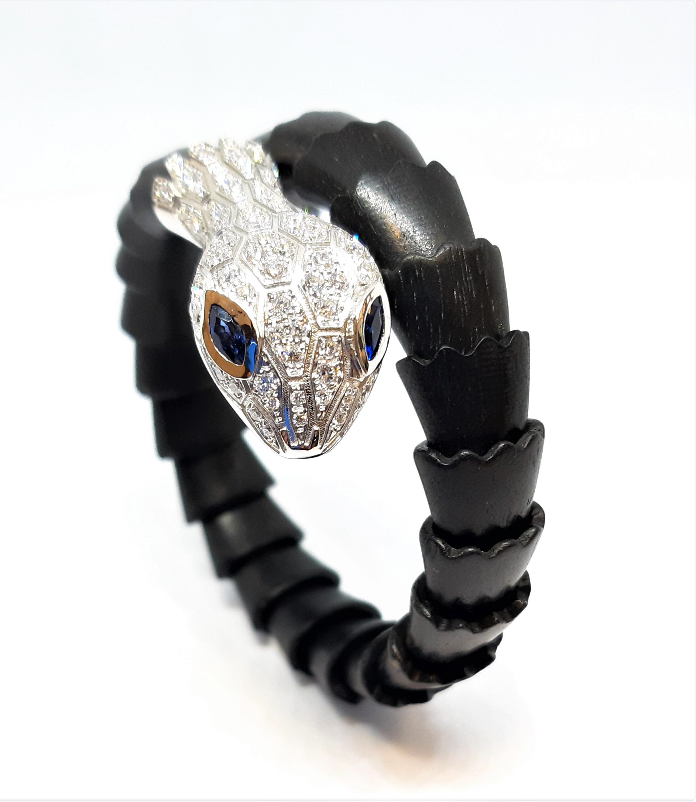 Bracciale “Serpente” in legno con testa e coda in oro bianco 18kt di gr.18,30 con incastonati diamanti taglio brillante del peso totale di ct.1,79 e due zaffiri taglio marquise del peso totale di ct.0,33