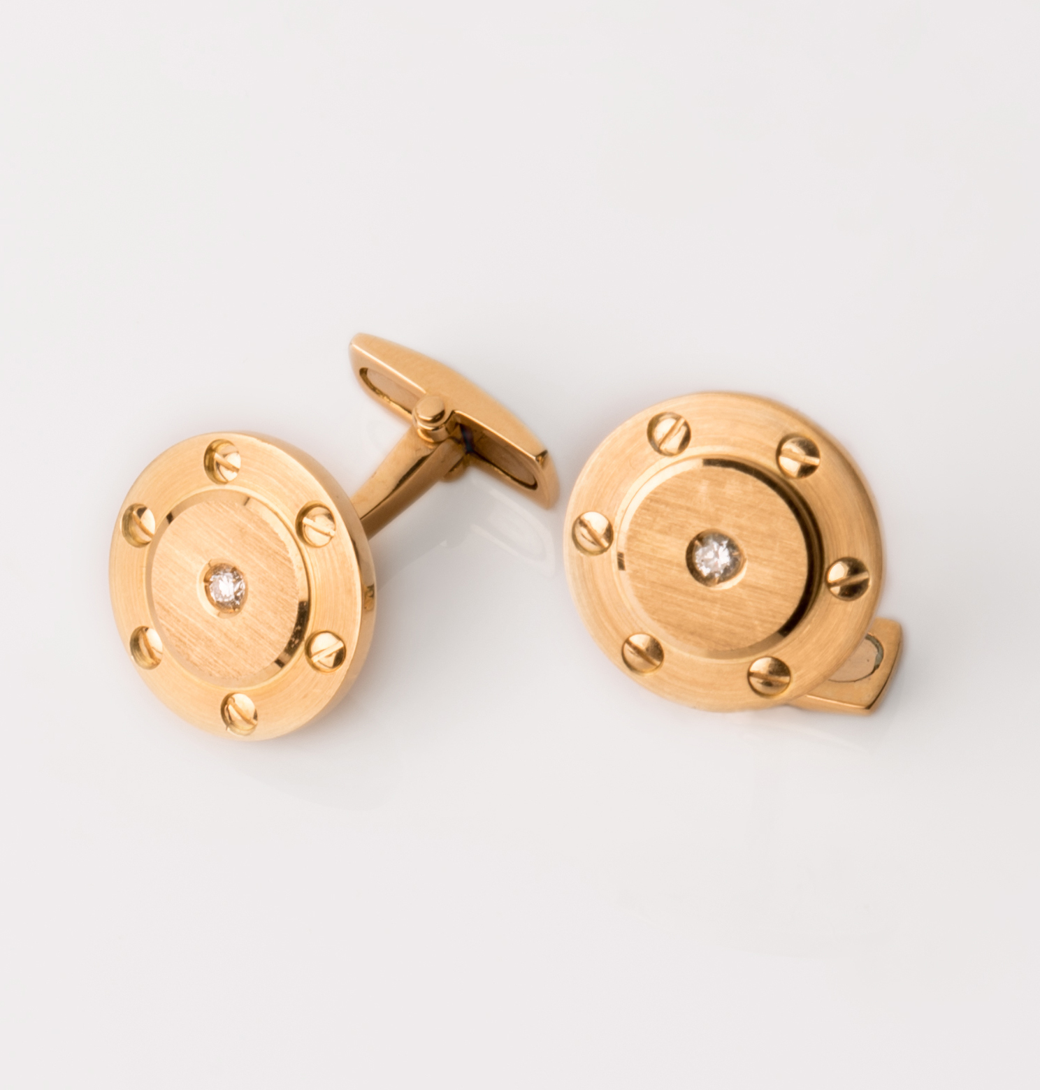 Gemelli in oro giallo 18kt di gr.18,00 con incastonati due diamanti taglio brillante del peso totale di ct.0,11