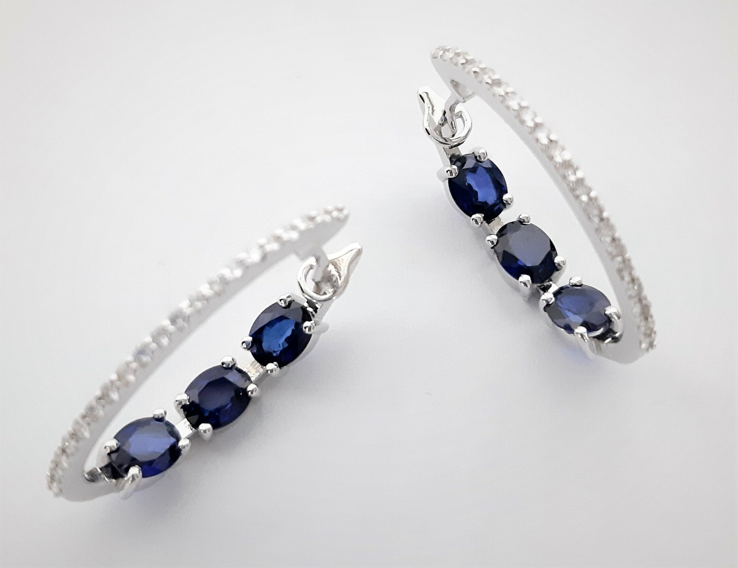 Orecchini in oro bianco 18kt gr.4,80 con incastonati zaffiri taglio ovale del peso totale di ct.2,68 e diamanti taglio brillante del peso totale di ct.0,29