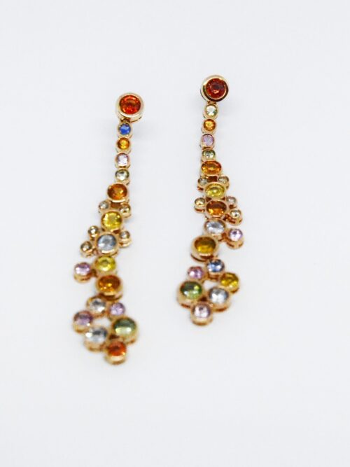Orecchini Grappolo pendenti oro, diamanti brown e zaffiri colore